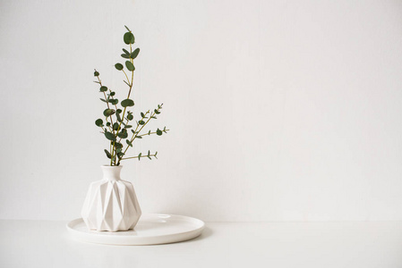 桉树分枝在白色陶瓷花瓶在空的墙壁背景照片 正版商用图片18ny43 摄图新视界